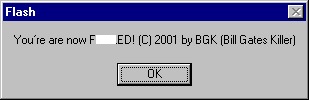 "You're are now F---ED! (C) 2001 by BGK (Bill Gates Killer)"