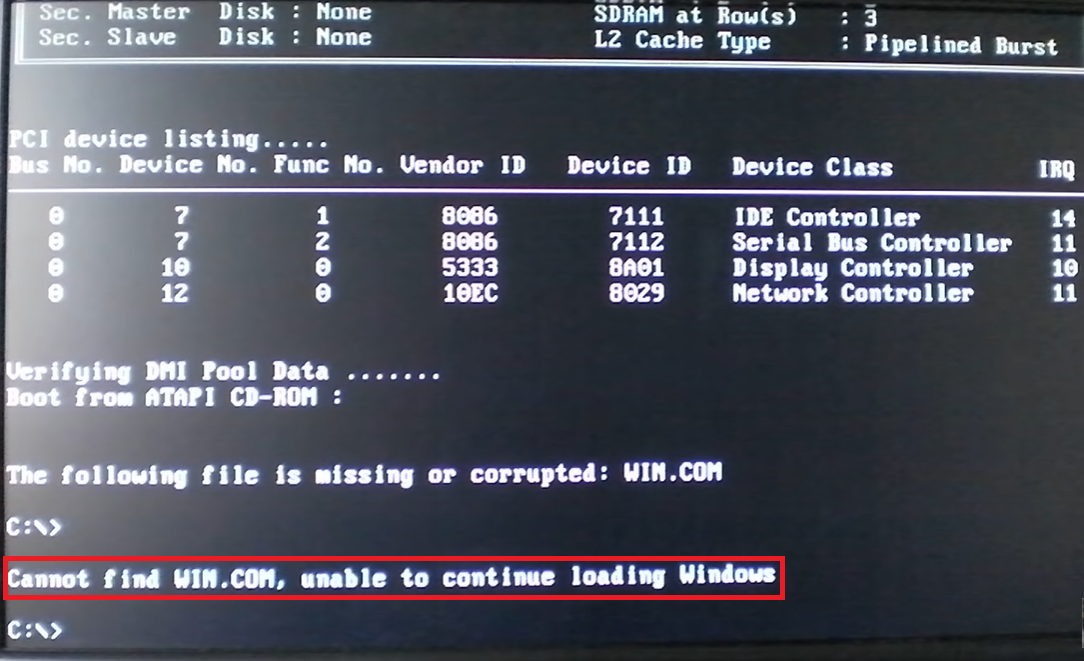 "Cannot find WIN.COM. unable to continue loading Windows"