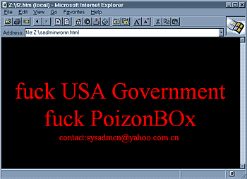 *이 바이러스는 UN군이 세르비아 베오그라드 주재 중국대사관을 폭격해서 중국인 사망자가 발생해서 이에 분노한 중국 해커들이 미국을 비방할 목적으로 만들어졌다고 할 수 있다.