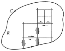 \(R\)을 \(C\)의 내부라 하자. 그러면 그린정리에 의해$$\int_{C}{udx-vdy}=\iint_{R}{(-v_{x}-u_{y})dA},\,\int_{C}{vdx+udy}=\iint_{R}{(u_{x}-v_{y})dA}$$코시-리만 방정식$$u_{x}=v_{y},\,u_{y}=-v_{x}$$로부터$$\iint_{R}{(-v_{x}-u_{y})dA}=0,\,\iint_{R}{(u_{x}-v_{y})dA}=0$$이므로 따라서 다음의 결과를 얻는다.$$\int_{C}{f(z)dz}=0$$구르사는 코시의 정리에서 \(f'\)이 연속일 조건이 없어도 됨을 증명했고, 이것을 코시-구르사 정리라고 한다.