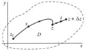 $$\int_{C_{1}}{f(z)dz}+\int_{-C_{2}}{f(z)dz}=0$$이므로$$\int_{C_{1}}{f(z)dz}=\int_{C_{2}}{f(z)dz}$$이고 따라서 적분은 \(D\)에 포함되는 경로와 독립적이다.$$F(z)=\int_{z_{0}}^{z}{f(s)ds}\,(z_{0}\in D)$$라 하자. 그러면$$F(z+\Delta z)-F(z)=\int_{z_{0}}^{z+\Delta z}{f(s)ds}-\int_{z_{0}}^{z}{f(s)ds}=\int_{z}^{z+\Delta z}{f(s)ds}$$이고 다음과 같이 \(z\)에서 \(z+\Delta z\)까지의 적분경로를 선분으로 선택할 수 있다.
