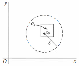 \(f\)는 \(R\) 전체에서 해석적이고 \(z_{0}\in R\)이므로 \(f'(z_{0})\)가 존재한다. 그러면 임의의 \(\epsilon>0\)에 대해 근방 \(|z-z_{0}|<\delta\)가 존재해서 이 근방의 모든 \(z(\neq z_{0})\)에 대해 다음의 부등식이 성립한다.$$\left|\frac{f(z)-f(z_{0})}{z-z_{0}}-f'(z_{0})\right|<\epsilon$$그런데 근방 \(|z-z_{0}|<\delta\)는 자연수 \(K\)가 충분히 커서 대각선의 길이가 \(\delta\)보다 작은 정사각형 \(\sigma_{K}\)를 포함한다.