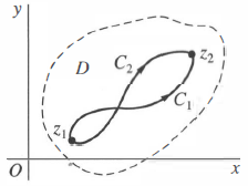 (ii) \(D\) 내부의 점 \(z_{1},\,z_{2}\)를 잇고, \(D\) 내부에 포함되는 임의의 경로에서 \(f(z)\)의 적분값은 항상 같다.