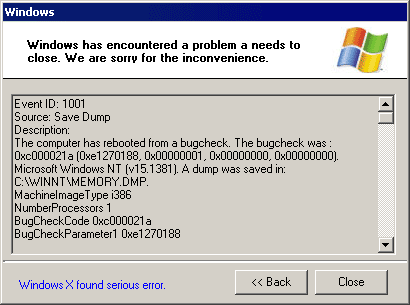 Windows has encountered a problem a needs to close. We are sorry for the inconvenience.