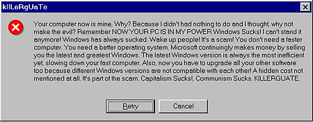 너의 컴퓨터는 이제 내 것이다. 왜? 왜냐하면 나는 할 일이 아무것도 없었고 내 생각대로 왜 악을 만들지 않았는가? 기억하라 이제 너의 컴퓨터는 내 손아귀에 있다. 나는 더 이상 서있을 수 없다! 윈도우는 항상 형편없다. 사람들을 자각하게 하라! 이것은 사기다. 너에게는 빠른 컴퓨터가 필요없다. 너는 나은 운영체제가 필요하다. 마이크로소프트는 너에게 최근과 최상의 윈도우를 팔아서 연속적으로 돈을 번다. 최근의 윈도우 버전은 가장 비효율적이고 너의 빠른 컴퓨터를 느리게 만든다. 또한 이제 너는 역시 너의 다른 소프트웨어들을 업그레이드할 필요가 있다. 왜냐하면 다른 윈도우 버전들은 서로 호환되지 않기 때문이다. 전혀 언급되지 않은 숨겨진 비용이 있다. 이것은 사기의 한 부분이다. 자본주의는 형편없다!, 공산주의도 형편없다. KILLERGUATE