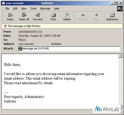 이 웜은 다음의 메일 형태로 전파됨이 발견되었다(*사실과 다를 수 있다).