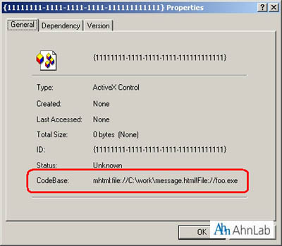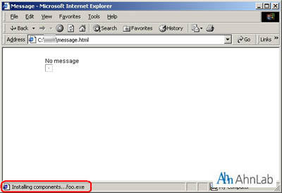 이 메일에는 message.zip라는 첨부파일이 있고, 그 내부에는 message.html파일이 존재한다. 이 파일에는 foo.exe를 포함하고 있고, 취약점을 가진 인터넷 익스플로어로 열어볼 경우 파일이 생성된다.