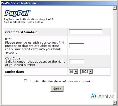 웜 바이러스는 앞에서 생성된 pp.hta와 index2.hta를 실행해 다음과 같은 가짜 PayPal 신용카드 결제 화면 창을 통해