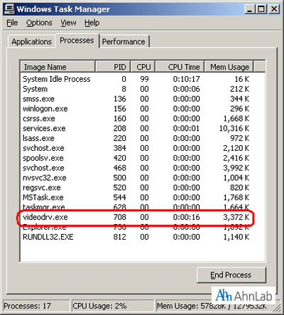 윈도우 NT계열(NT, 2000, XP)에서 윈도우 작업관리자(Ctrl+Alt+Del키를 동시에 눌러 확인가능)로 videodrv.exe파일이 실행중임을 알 수 있다.