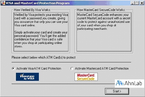 트로이목마가 실행되면 'VISA and MasterCard Protection Program'이라는 이름의 가짜 보안프로그램을 실행시킨다.
