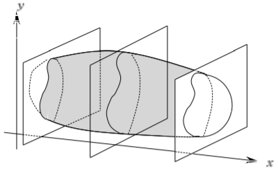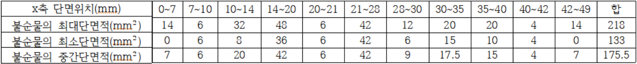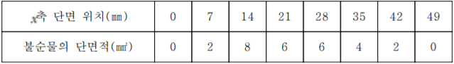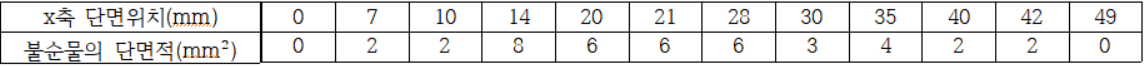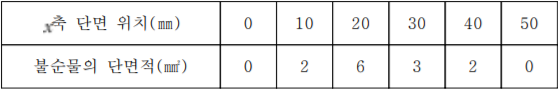 (사) X-선 컴퓨터 단측촬영(X-ray CT)은 물질 내에 있는 불순물의 크기를 밝히는 데 사용되기도 한다. 모 회사 연구소에서 세라믹 내부에 크기를 알 수 없는 금속 불순물 덩어리 하나가 발견되었다. 이 불순물의 부피를 알기 위해 x축을 따라가며 10mm 간격으로 단층촬영을 한 결과 불순물의 단면의 넓이가 아래 표와 같이 주어졌다.