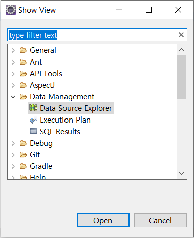 Other를 클릭하면 위 화면처럼 나온다. Data Management에서 'Data Source Explorer'를 Open한다.