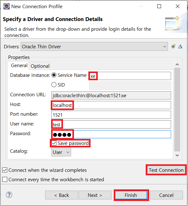 OK를 누르면 위 화면이 나타난다. Server Name은 xe로, Host는 localhost로, username는 test, password도 test로 입력한다. 또한 편리함을 위해 save password에 체크한다.