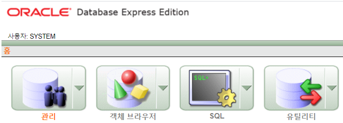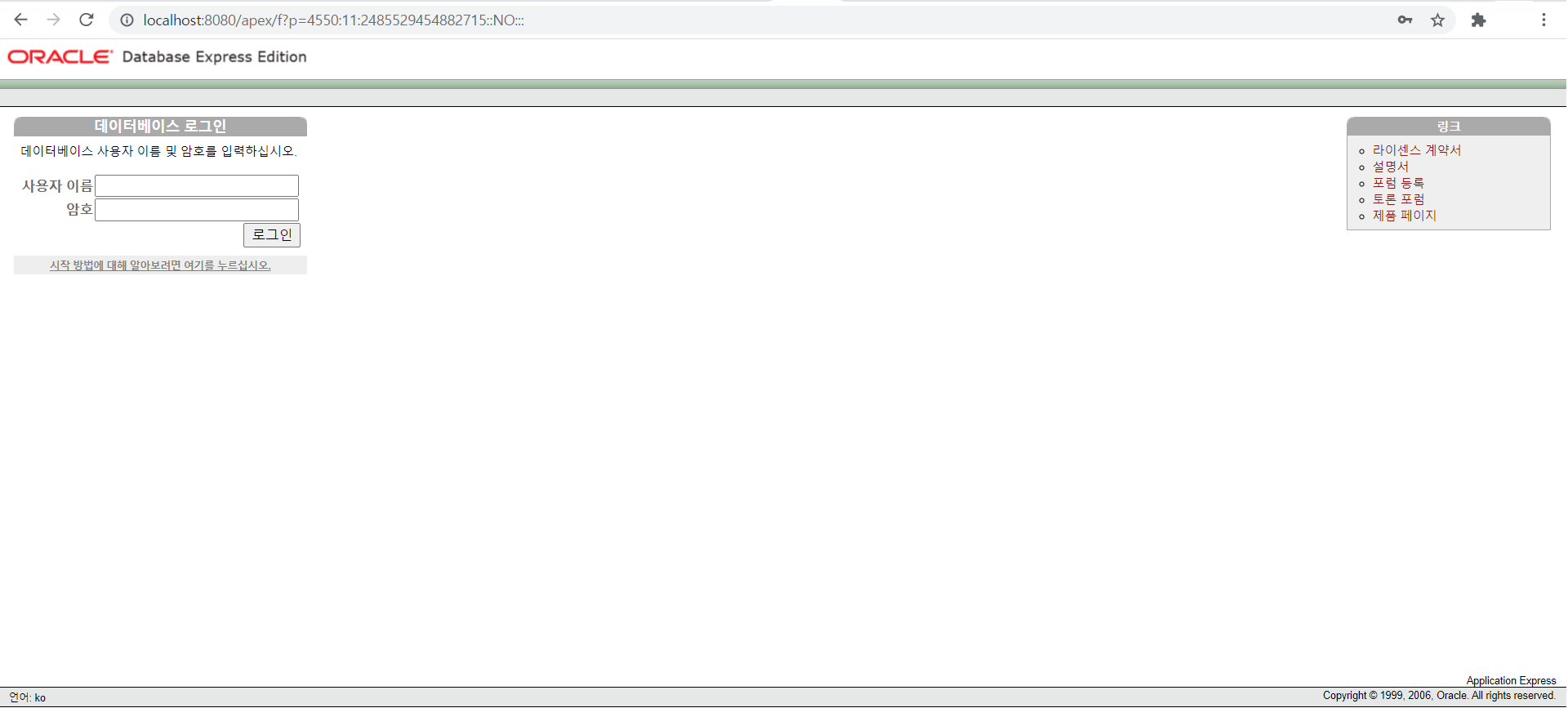 주소 http://localhost:8080/apex를 입력하면 위와 같이 ORACLE Database Express Edition이 뜬다.