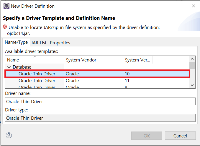 Name/Type에서 Database는 Oracle Thin Driver, System Vendor는 Oracle, System Version은 10을 선택한다.