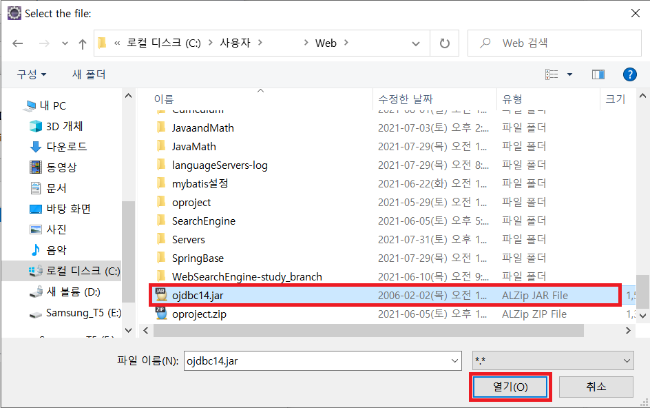 그러면 파일 찾기가 뜰 것이고, 여기서 'ojdbc14.jar'를 선택하고 '열기'를 누른다.