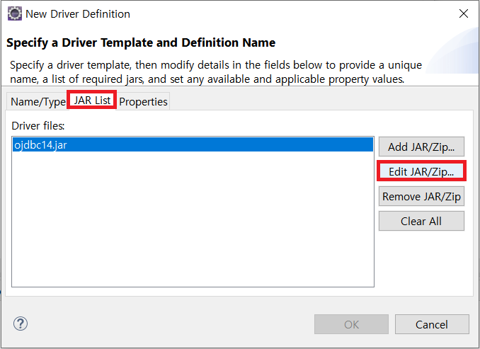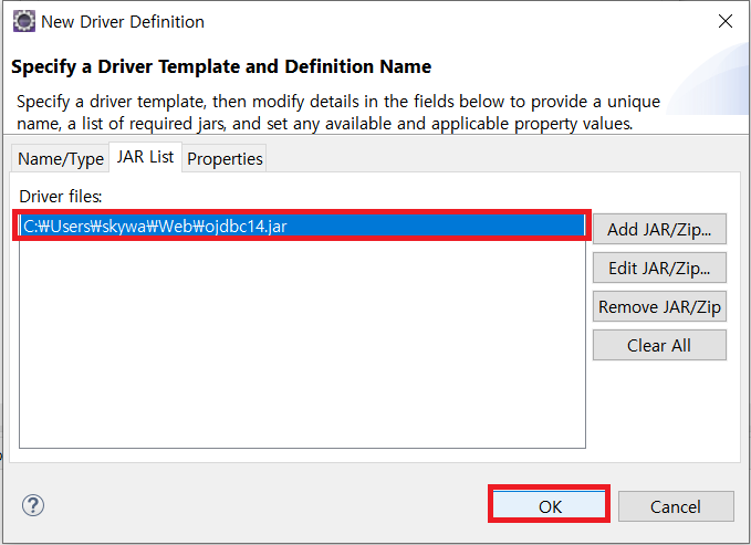 열기를 눌렀으면 Driver files에 ojdbc14.jar이 나타날 것이고, 이것을 클릭한 다음 OK를 누른다.
