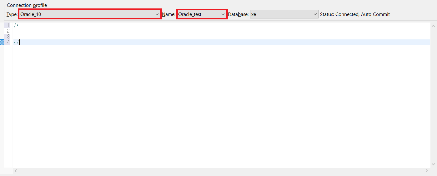 오라클을 실행시키려면 Sql파일을 실행시키면 된다. 이때 Type에 설치한 오라클 버전인 Oracle_10을, Name에는 Oracle_test를, Database에는 xe(선택사항, 입력 안해도 된다)를 입력한다.