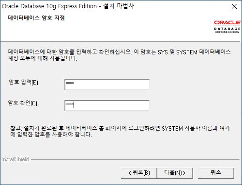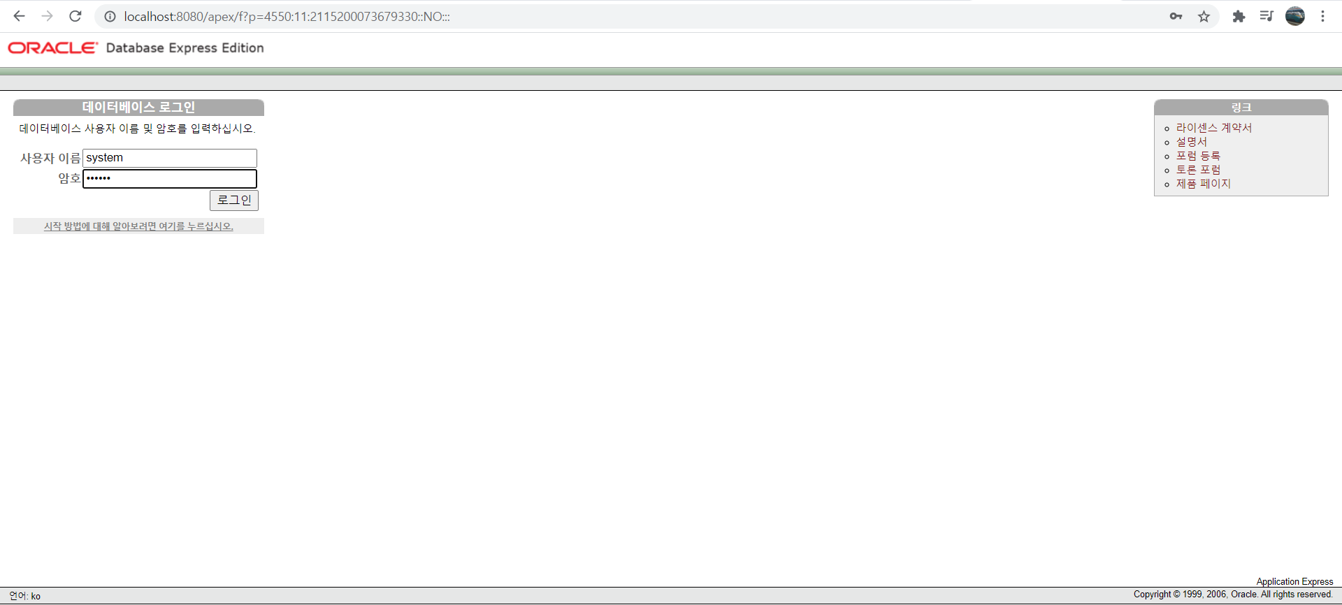 암호 입력부분이다. 기본적으로 오라클은 관리자 ID가 system이다.