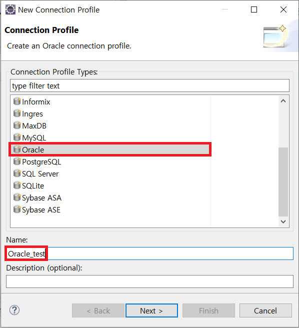 New를 클릭하면 위 그림처럼 New Connection Profile이 뜬다. 여기서 Oracle을 선택하고 이름을 Oracle_test로 지정한다. 다 마쳤으면 Next를 누른다.