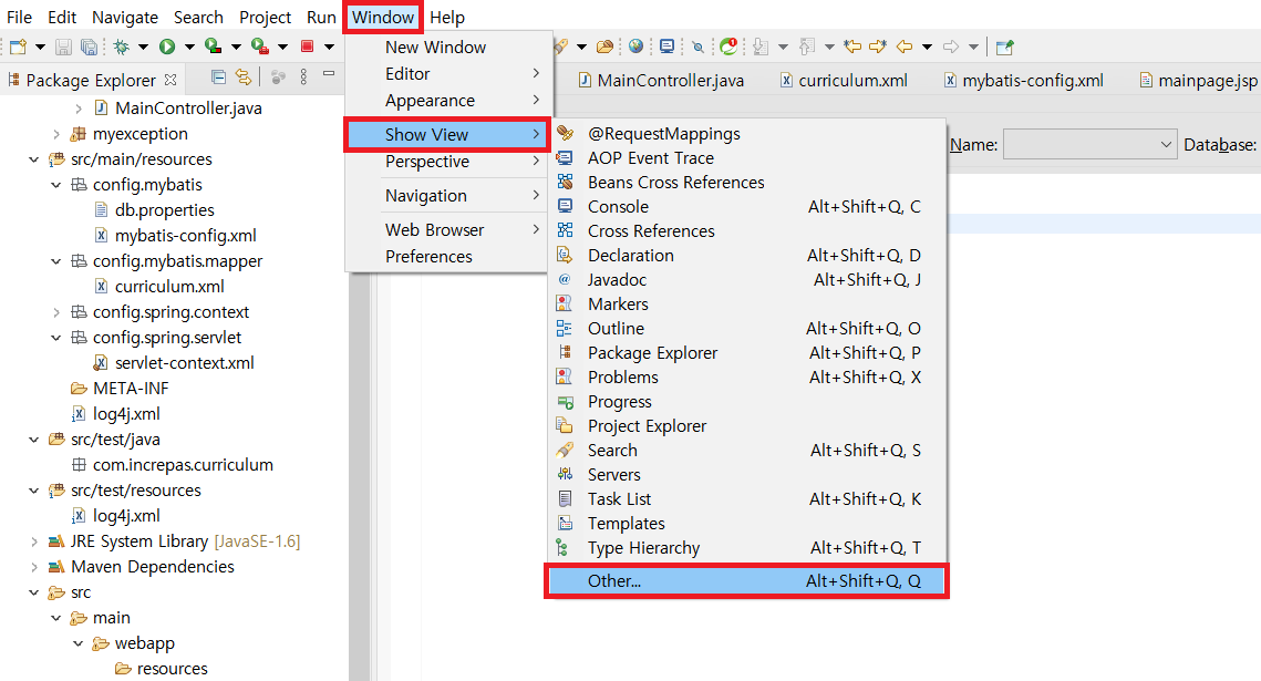 이클립스 창에 있는 Window로 들어간 다음 Show View->Other를 클릭한다.