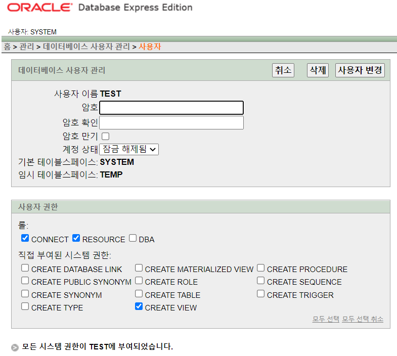 사용자 권한에서 롤의 CONNECT, RESOURCE를 체크하고, 직접 부여된 시스템 권한에 CREATE VIEW를 클릭한다.
