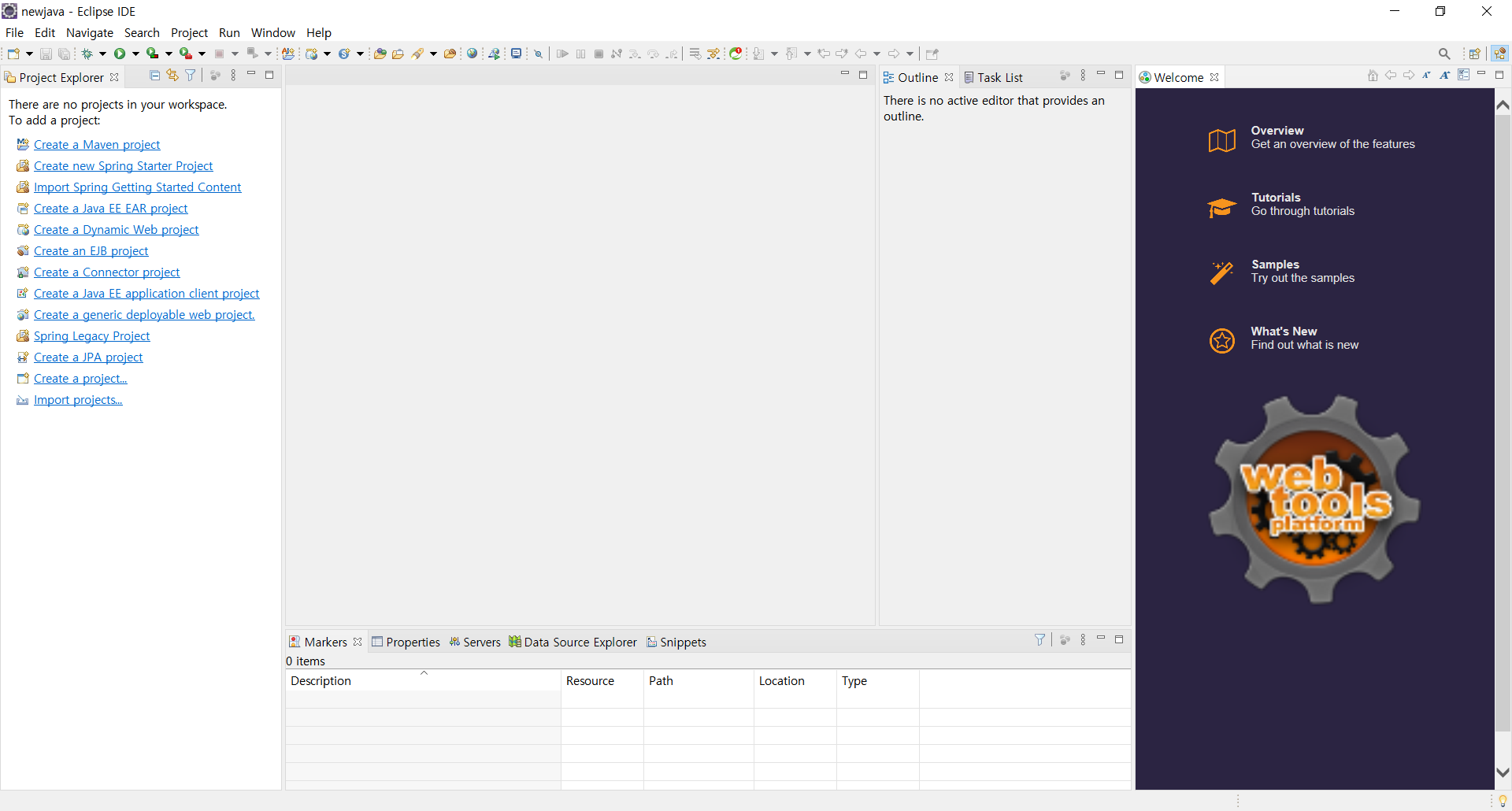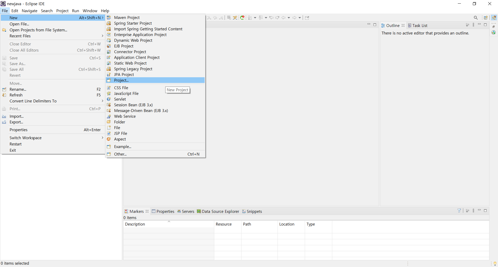 클릭하면 위 왼쪽 위에 Project Explorer이 나타나고 그 밑으로 Create.... 의 문구가 있다.
