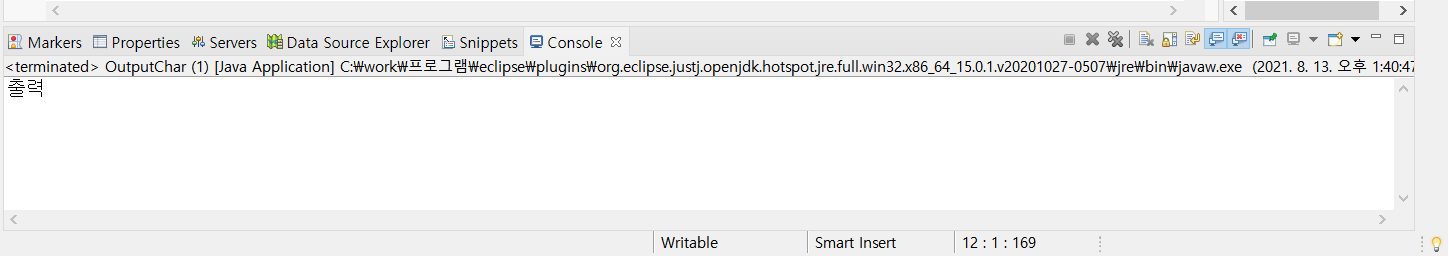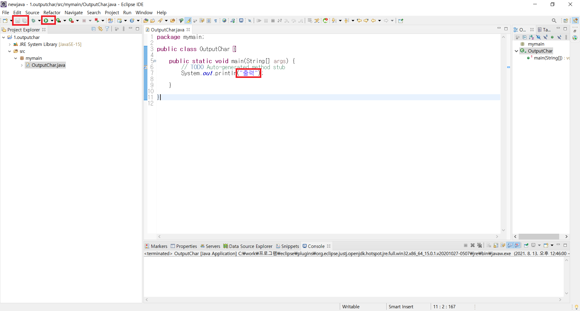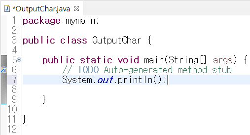 System.out.println();에 있는 괄호 안에 큰 따옴표를 입력하고, 그 사이에 '출력'이라는 글자를 입력한다.