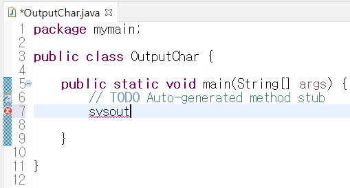 초록글씨(주석) 끝에서 엔터치면 슬러시 밑으로 커서가 이동한다. 이때 sysout을 치고 커서가 t 바로 옆에 있는 상태에서