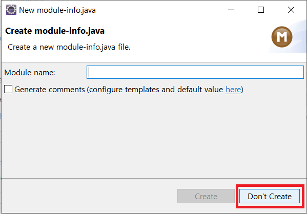 Finish를 누르면 module-info.java를 만든다는 창이 뜨는데 Don't Create(안만든다)를 클릭한다.