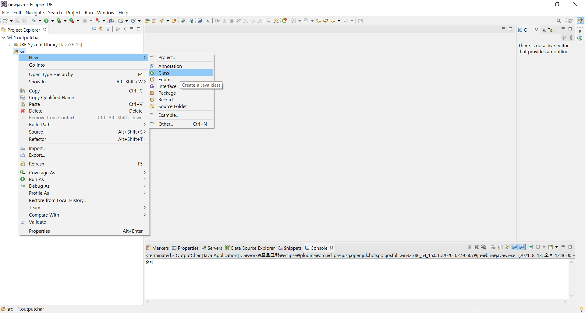 마우스를 src에 갖다대고 오른쪽을 누른다. 그러면 창이 뜰 것이고 New->Class를 누른다.