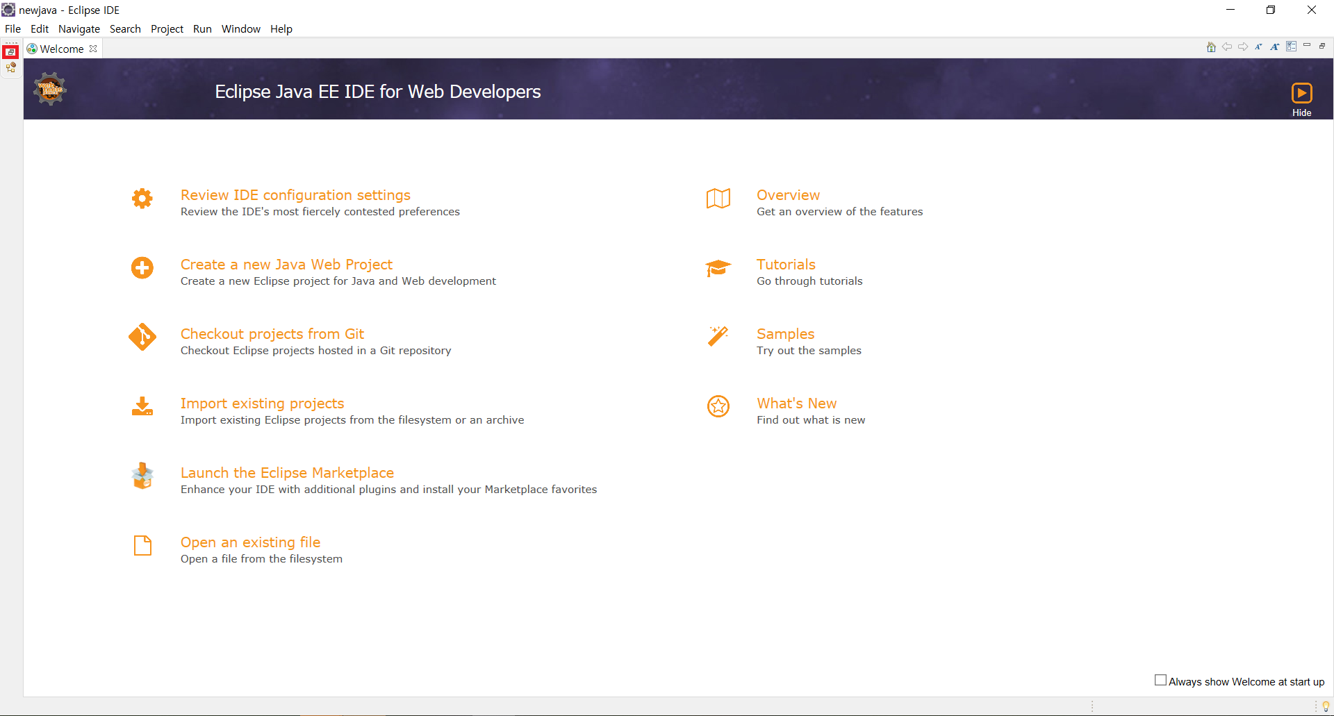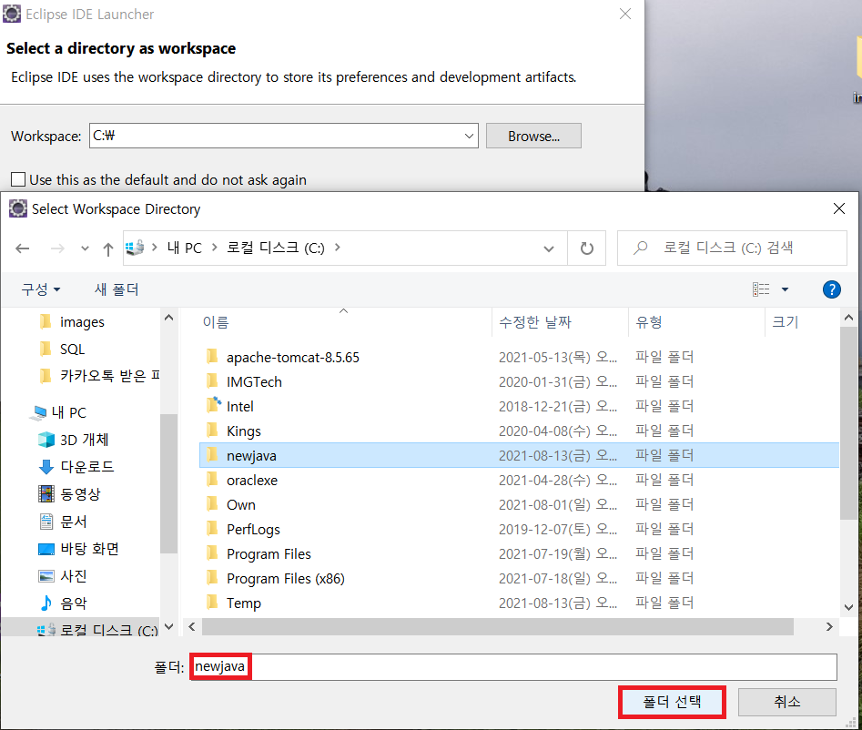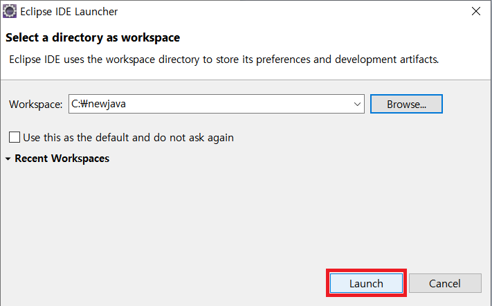 workspace(프로그램 파일들을 저장할 폴더)를 지정한다. 앞에서 새로 만든 newjava라는 폴더를 선택한다.