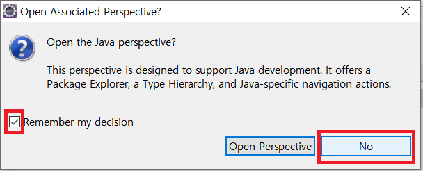 그 다음으로 Open Associated Perspective?가 뜨는데 Remember my decision을 체크하고 No를 클릭한다.