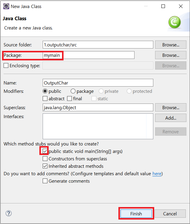 Package에는 mymain, public static void main(String[] args)에 체크한다.