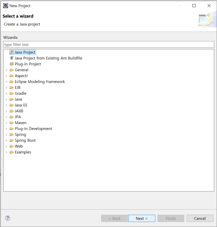 클릭하면 위 창이 뜰 것이고 맨 위의 Java Project를 누른 다음 Next를 누른다.