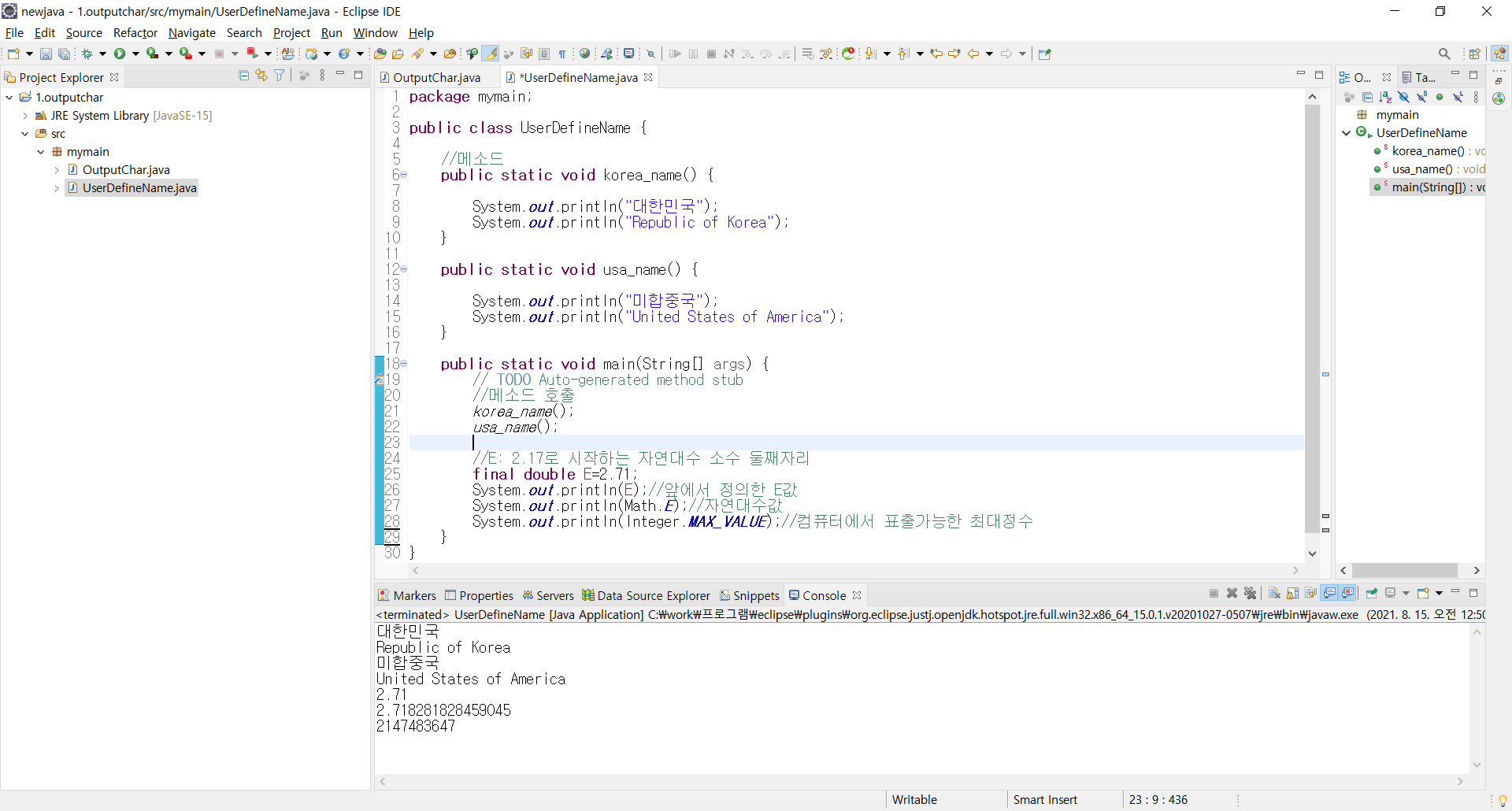 다음은 메소드와 상수를 출력하는 자바 프로그램의 예시이다.