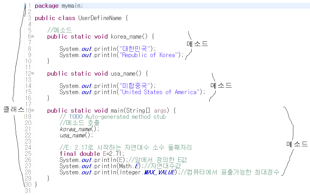 이 프로그램에서 메소드는 korea_name(), usa_name()이고 이들은 각각 한국, 미국의 정식명칭을 영어명과 함께 출력하는 것이다.
