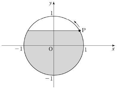 [문제] 다음 그림과 같이 좌표평면에서 원 \(x^{2}+y^{2}=1\) 위의 점 \(\text{P}\)가 점 \((1,\,0)\)에서 출발하여 원점을 중심으로 매초 \(\displaystyle\frac{1}{40}\)(라디안)의 일정한 속력으로 원 위를 시계 반대 방향으로 움직이고 있다.
