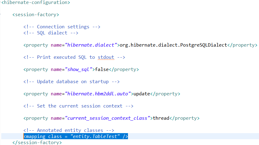 다음으로 hibernate.cfg.xml로 들어가서 다음과 같이 <mapping class = "entity.TableTest" />을 작성한다.