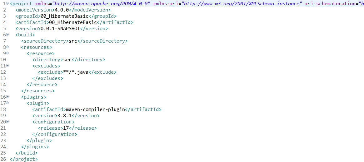 위 사진은 pom.xml의 기본 소스코드이다. 여기의 <build> 밑(</build>)에 <dependencies>를 추가하고, 그 안에 다음의 hibernate, postgresql dependency를 추가한다.