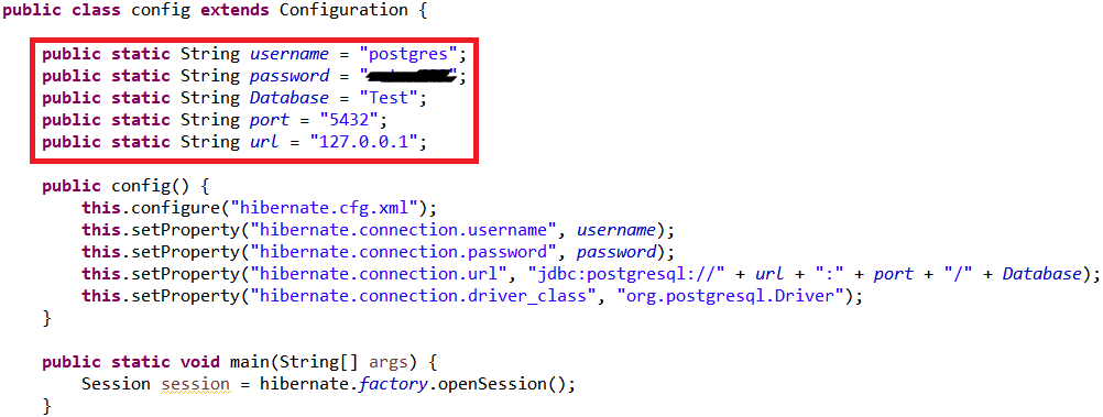 다음으로 config에서 다음과 같이 설정하고(빨간색 박스 부분, password는 각자가 설정한 비밀번호로 작성하고, Database에는 pgAdmin의 DB 이름을 적는다),
