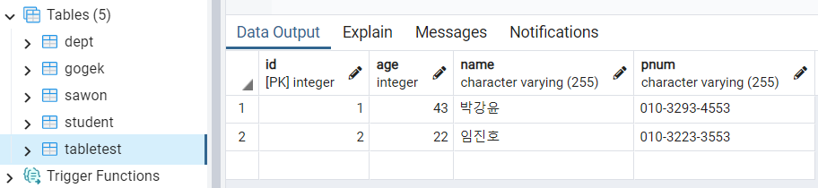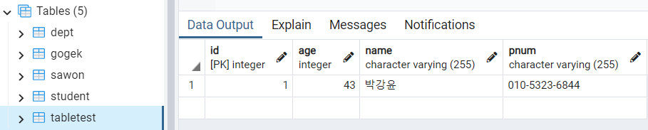 pgAdmin 들어가서 다음과 같이 앞에서 입력한 데이터가 저장되었음을 확인한다.