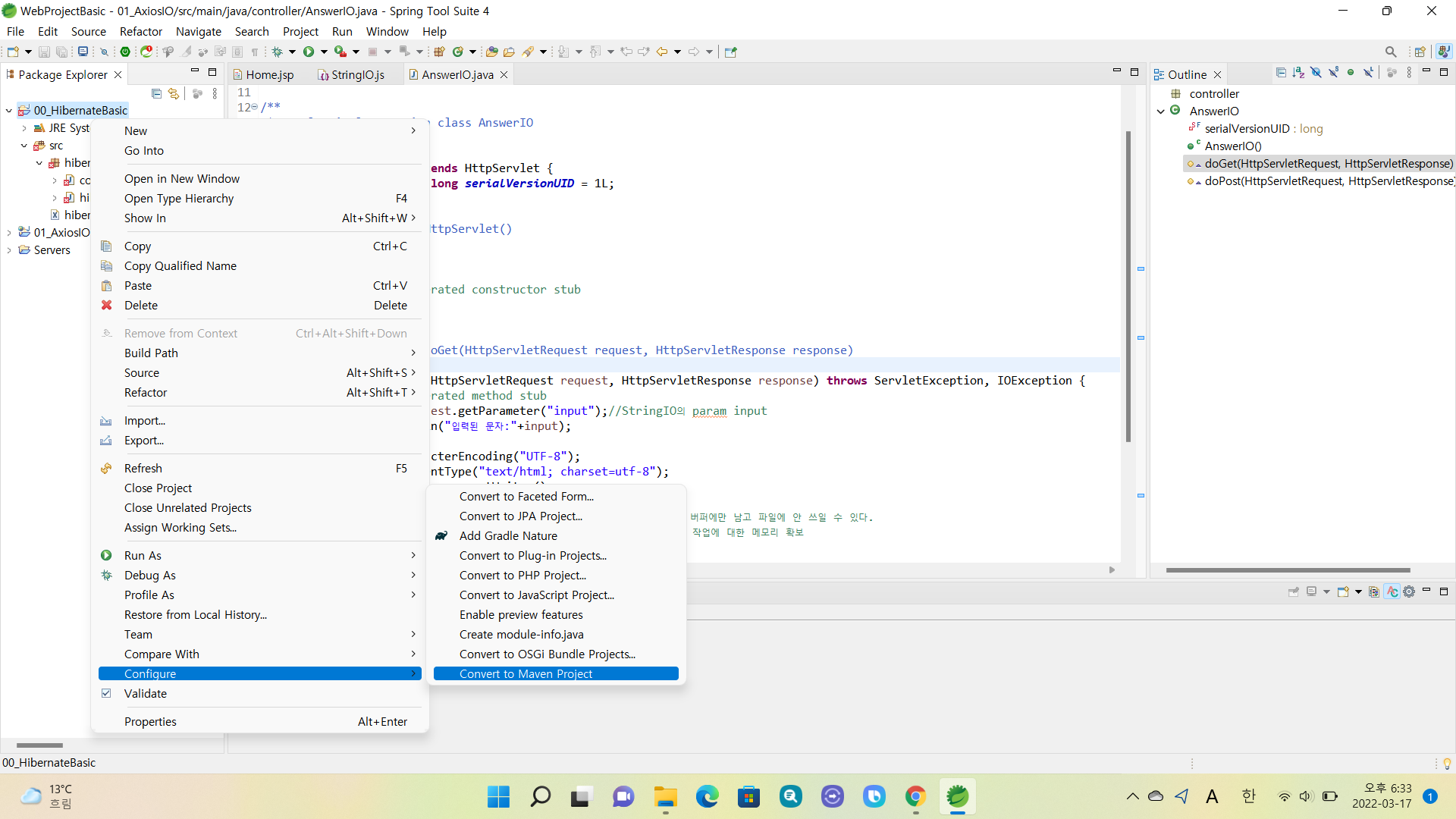 프로젝트에 마우스를 갖다 댄 다음 오른쪽을 클릭해 Configure => Convert to Maven Project를 클릭한다.