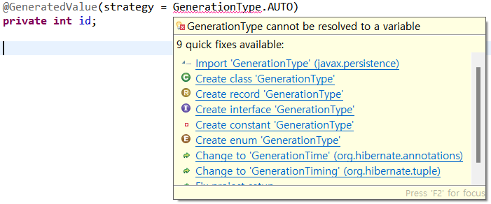 *GenerationType.AUTO를 입력할 때 자동완성(ctrl+space)이 안될 것이다. 그러니 다 작성한 다음에 ctrl+space키를 누른다. 그러면 다음 사진처럼 자동완성 창이 뜰 것이다. 거기서 Import 'GenerationType'를 누른다.