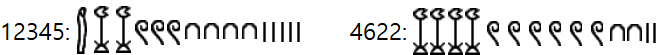 수직 막대 하나는 1, 거꾸로 된 반원인 쪽문 또는 발뒤꿈치 뼈는 10, 대문자 C와 비슷한 올가미는 100, 연꽃은 1000, 구부러진 손가락은 10000, 올챙이와 비슷한 물고기는 100000, 무릎꿇은 사람은 1000000을 나타낸다.