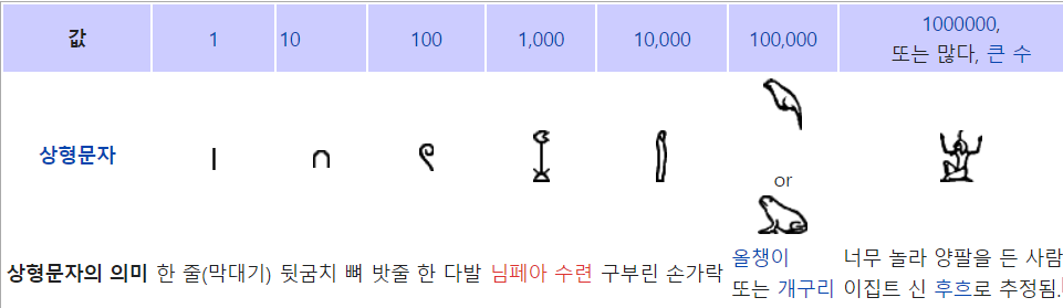 이집트에서는 신성문자로 기록이 작성되었다. 신성문자로 작성된 명수법이 해명되었다. 명수법은 10진법에 기초하고 있다. 10의 1~6제곱까지의 각 거듭제곱을 구별하는 기호와 그것들을 단순히 되풀이하여 나타난 100만을 넘는 수를 돌과 나무 따위에 새겼다.