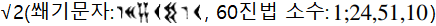 이것은 오늘날 10진 소수기수법이 우리에게 주는 계산능력을 바빌로니아인들은 이미 갖고 있음을 뜻한다. \(\sqrt{2}\)를 소수점 세 자리까지 나타낸 바빌로니아 서판이 있다. 이 서판에 따르면 \(\sqrt{2}\)를 쐐기문자와 60진법으로 다음과 같이 나타냈다.