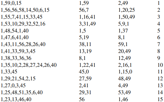 두, 세번째 열은 다음의 직각삼각형 ABC의 변 \(a,\,c\)의 값, 첫째 열은 \(\sec^{2}(\angle A)=\frac{c^{2}}{b^{2}}\)의 값이 기록되었다.
