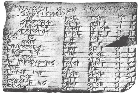 다른 서판에서 등비수열의 합 \(1+2+2^{2}+\cdots+2^{9}\)를 계산하고, 또 다른 서판에서는 \(1^{2}+2^{2}+\cdots+10^{2}\)을 계산했다. 그러나 메소포타미아의 서판은 이집트의 파피루스 처럼 특정한 경우만을 다루고 있다.