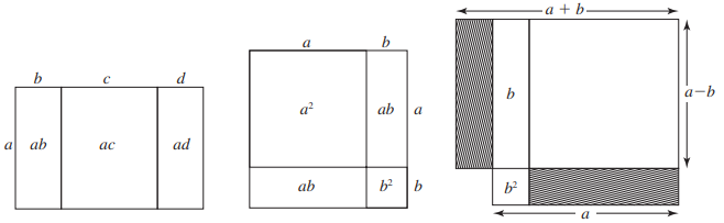 분배법칙 \(a(b+c+d)=ab+ac+ad\)는 다음 그림과 같이 선분 \(a\)와 각 선분 \(b,\,c,\,d\)의 합으로 만든 직사각형의 넓이는 선분 \(a\)와 각 선분 \(b,\,c,\,d\)로 따로 만든 세 직사각형의 넓이의 합과 같다는 것이다. 또한 항등식 \((a+b)^{2}=a^{2}+2ab+b^{2}\)와 \(a^{2}-b^{2}=(a+b)(a-b)\)도 다음 그림을 통해 알 수 있다.